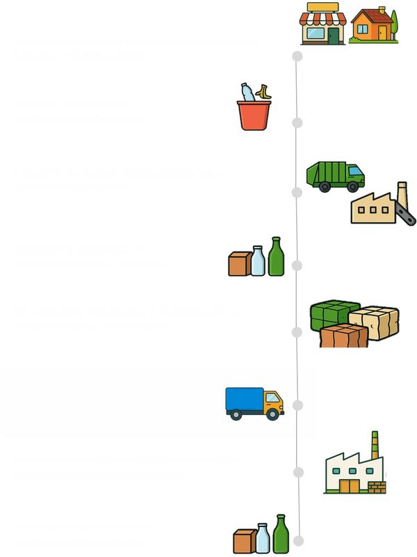 Ser el eje clave en la transición hacia una economía circular en México, facilitando el acceso a materiales de post-consumo y promoviendo su reintegración en procesos productivos sostenibles. A través de alianzas estratégicas, innovación en la cadena de suministro y optimización de la comercialización de residuos valorizables, buscamos reducir la dependencia de materias primas vírgenes y así generar un impacto ambiental y económico medible.